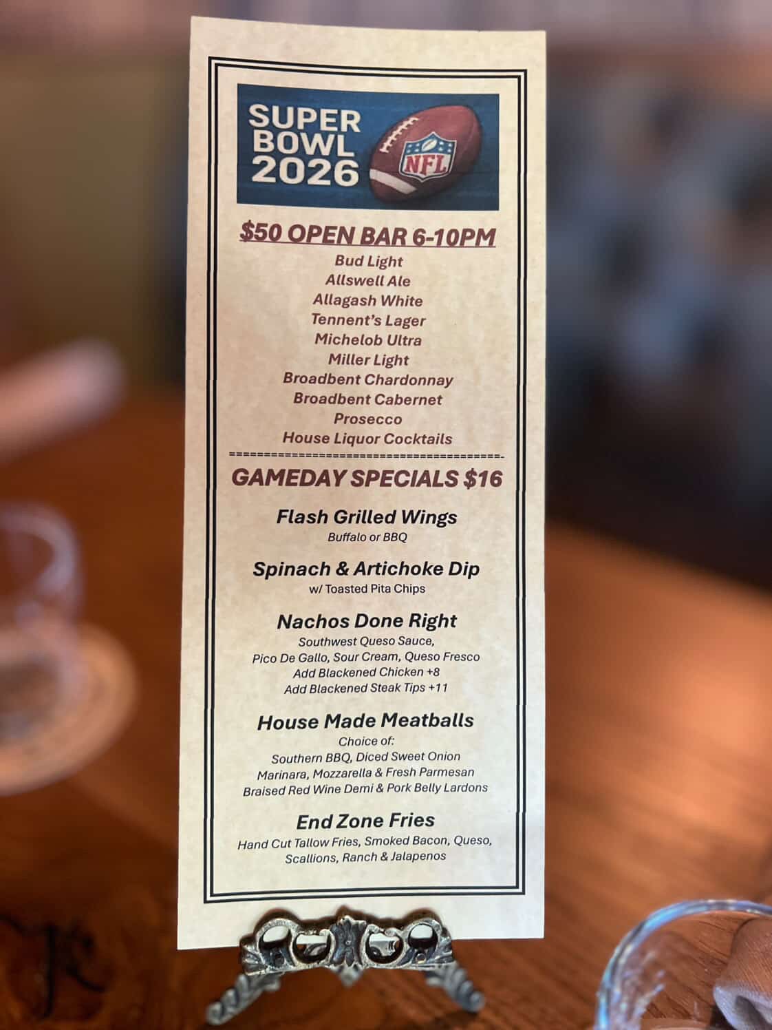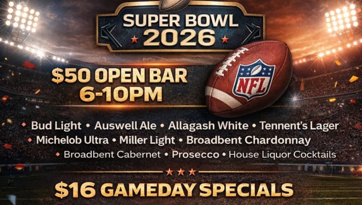 Enjoy an Open Bar for $50 from 6:00–10:00 PM, plus $16 Game Day Food Specials, with our full regular menu also available all night long.