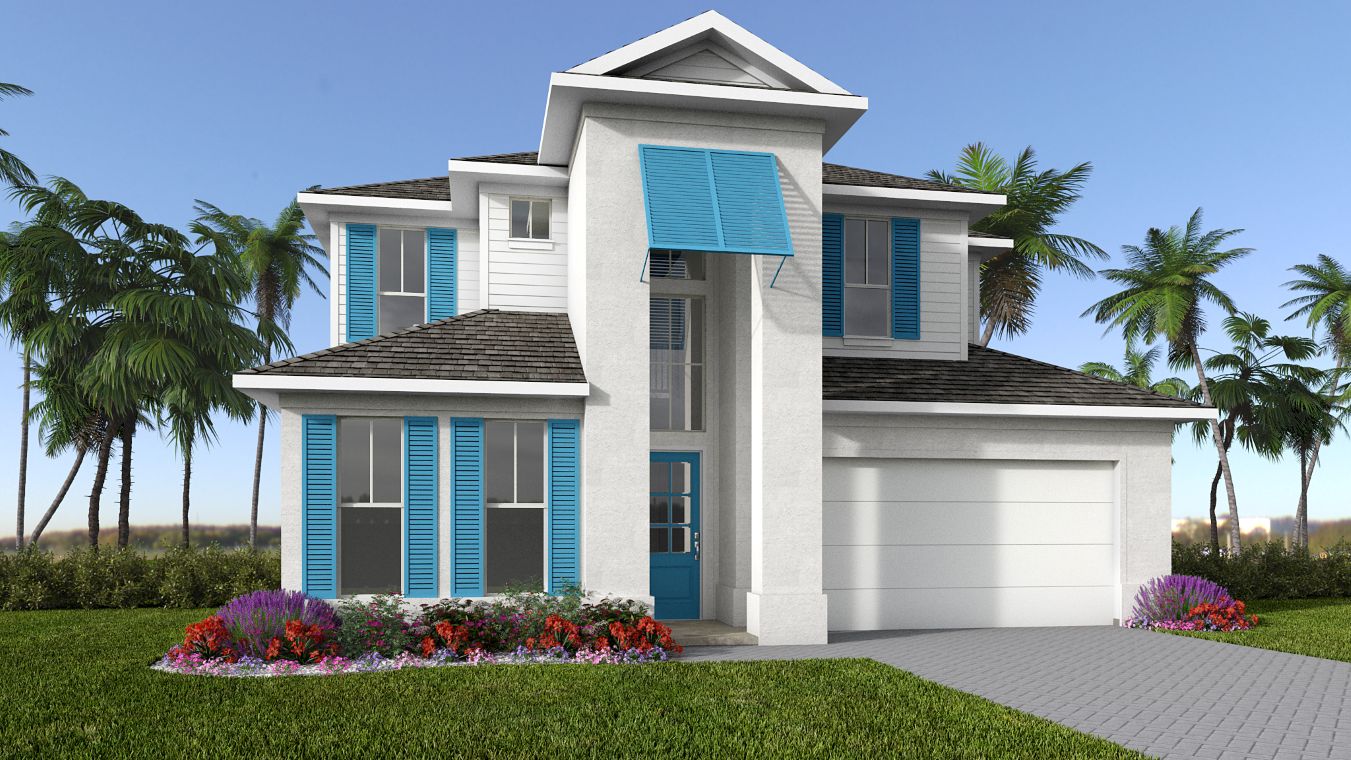Front porch opens into a two-story entryway that is embraced by French doors that welcome you into the secluded home office. Past the staircase you enter the kitchen space which features an island with built-in seating and an oversized walk-in pantry. The dining area connects the space to the family room. A wall of windows that overlooks the backyard covered lanai and extended ceilings complete the family room. The primary bedrooms boasts three large windows. Double doors lead into the primary bathroom which features dual vanities, a garden tub, glass enclosed shower, and large walk-in closet. A secluded guest suite with a full bathroom is located across the dining area. Upstairs you are greeted by a large game room overlooking the first floor. Two secondary bedrooms and a full bathroom complete the second level. Ample storage space throughout the home along with a conveniently located laundry room off the drop zone. Two-car garage.