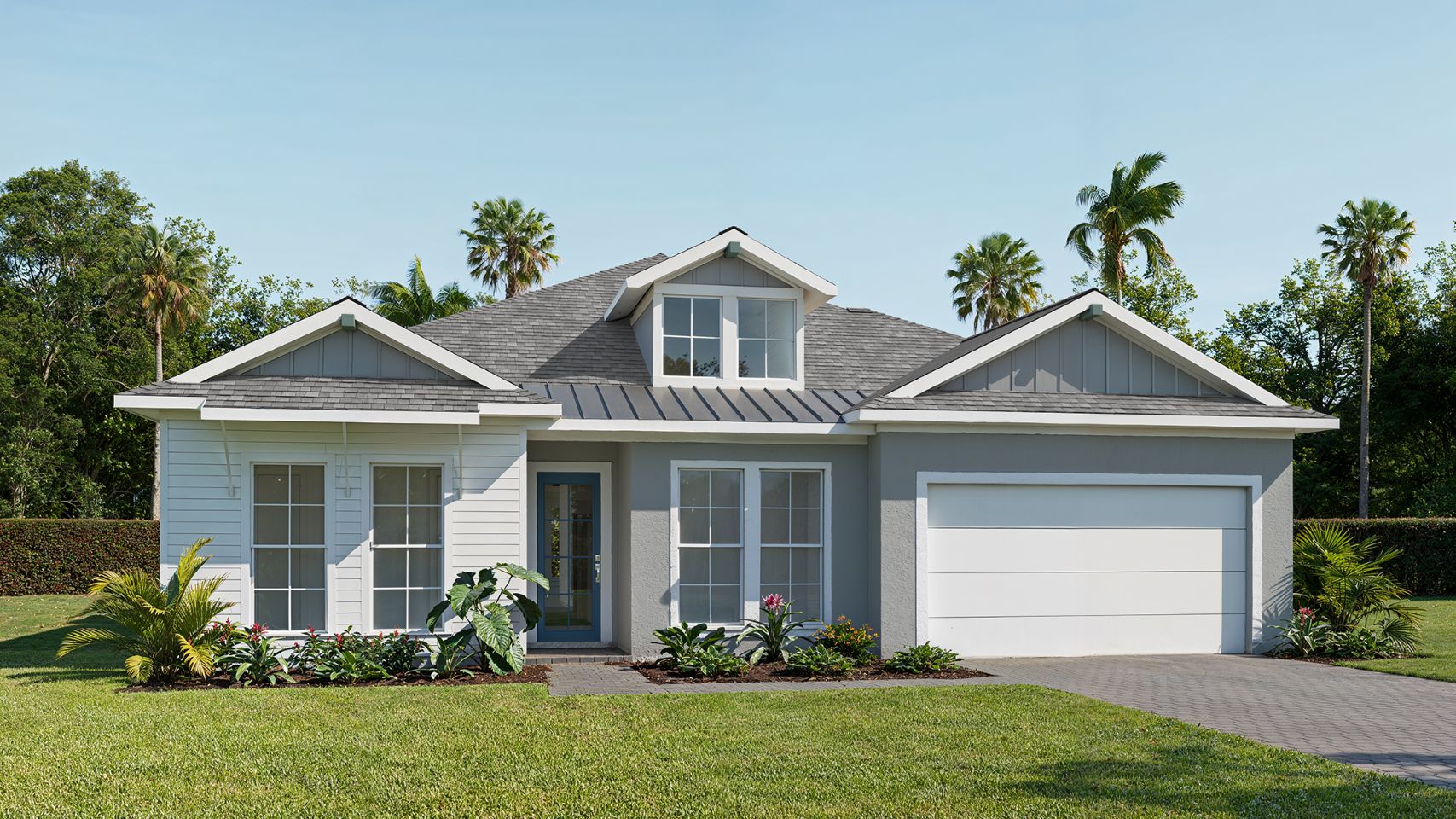 The front porch opens into the extended entryway lined with a 12-foot tray ceiling. French doors open into the home office that overlooks the front yard. Two secondary bedrooms are off the main hallway and feature walk-in closets and a shared bathroom. You pass a bonus flex room with storage space before entering the heart of the home. The dining area with three large windows connects to the open concept family room boasting ample natural light from the wall of windows. The kitchen hosts an island with built-in seating and corner walk-in pantry. The morning area is lit up by the corner wall of windows and allows access to the backyard covered lanai. A half-bathroom is off the kitchen. The primary bedroom boasts a wall of windows. Double doors lead into the primary bathroom which hosts dual vanities, a garden tub, glass enclosed shower, and two walk-in closets. A private guest suite with full bathroom is located off a shared hallway with the laundry room. The drop zone is just off the three-car garage.