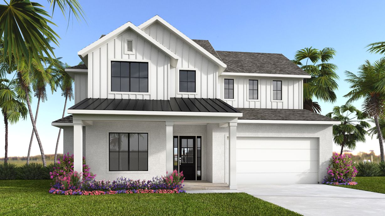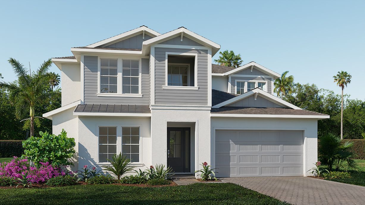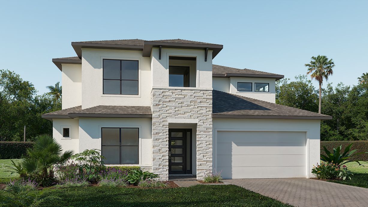 The front door opens into a two-story entrance. French doors open into the home office right off the entryway. A private guest suite with full bathroom, linen closet and walk-in closet is next to home office. The dining room is across the staircase. As you enter the family room you are embraced by ample natural light from the wall of windows. The kitchen boasts an island with built-in seating, a butler’s pantry that leads to the dining room, and a walk-in pantry. The morning area is embraced by a corner of windows and allows access to the backyard covered lanai. The primary bedroom is off the family room and boasts a wall of windows. French doors open into the primary bathroom which features dual vanities, a garden tub, glass enclosed shower, and two walk-in closets. Upstairs you will be greeted by a game room with access to a flex room. The secondary bedrooms and mechanical room complete the second floor. The laundry room and drop zone are located off the three-car garage.