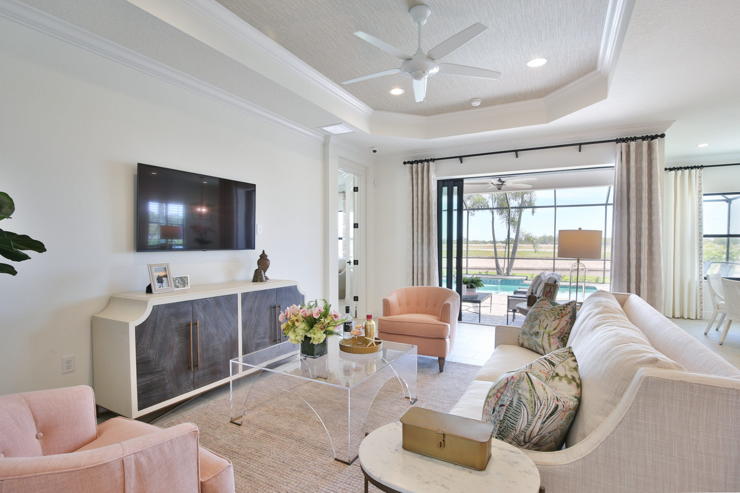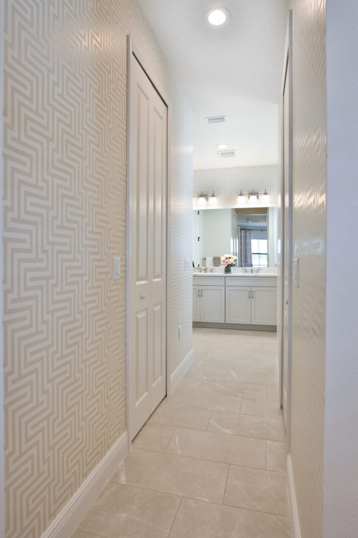 The Applause at Palm Grove is an endearing coastal-inspired design, offering an elegant yet comfortable place to call home. The open main living area includes a kitchen and dining room area, allowing meals to be seamlessly brought from pan to table. The kitchen features an island and walk-in pantry, an ideal stage for the family chef. Pocket sliding glass doors in the great room with recessed ceiling open to the covered lanai, where you can relax and enjoy the water or preserve view.