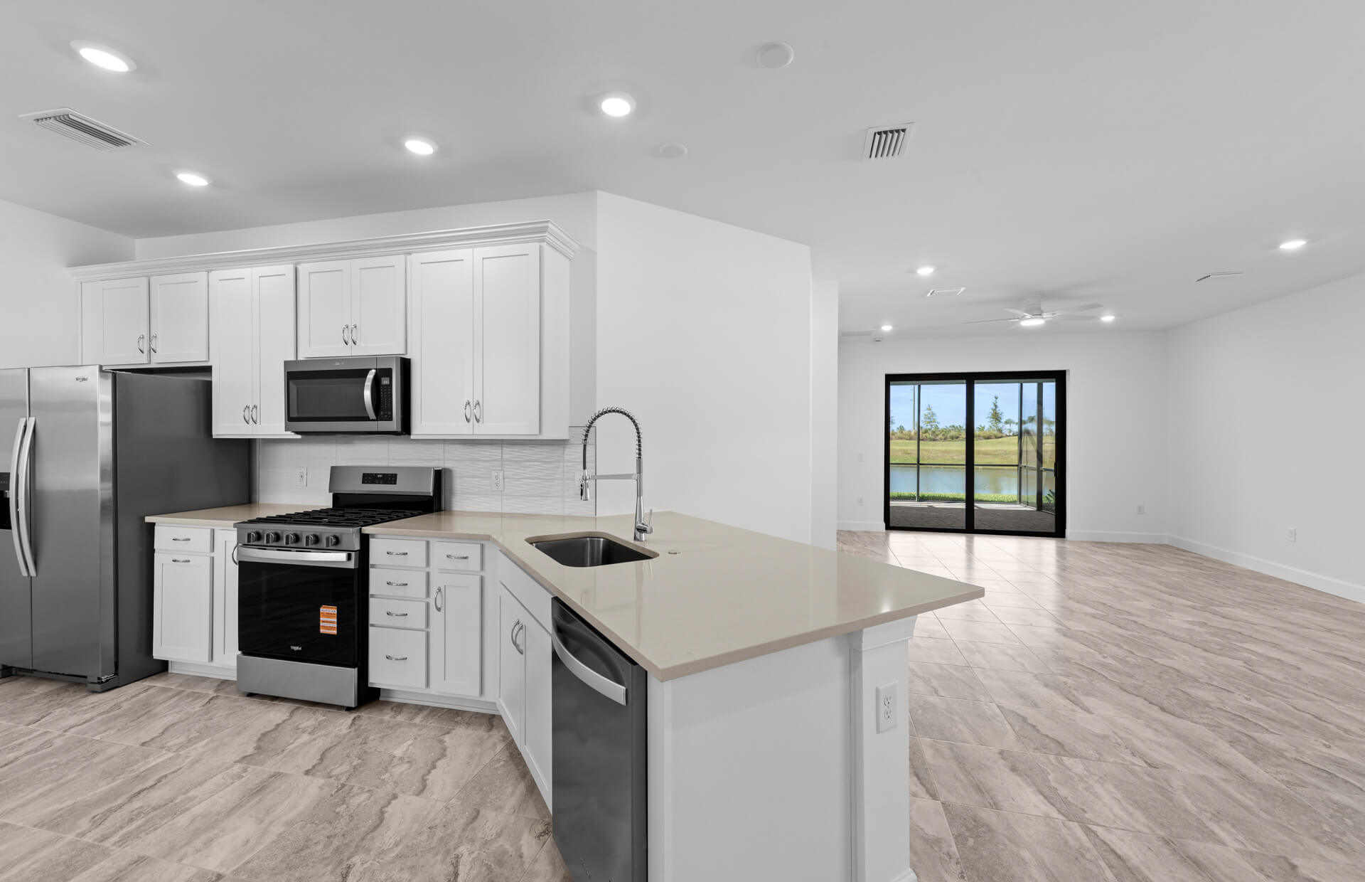 The Cascadia is filled with light and airy open living areas. The kitchen features elegant wood cabinetry and bar top, perfect for serving or entertaining guests. The quaint café, open to the kitchen and gathering room, is ideal for casual or formal dining. Just off the foyer is a flex room, which can be an office, den or third bedroom.